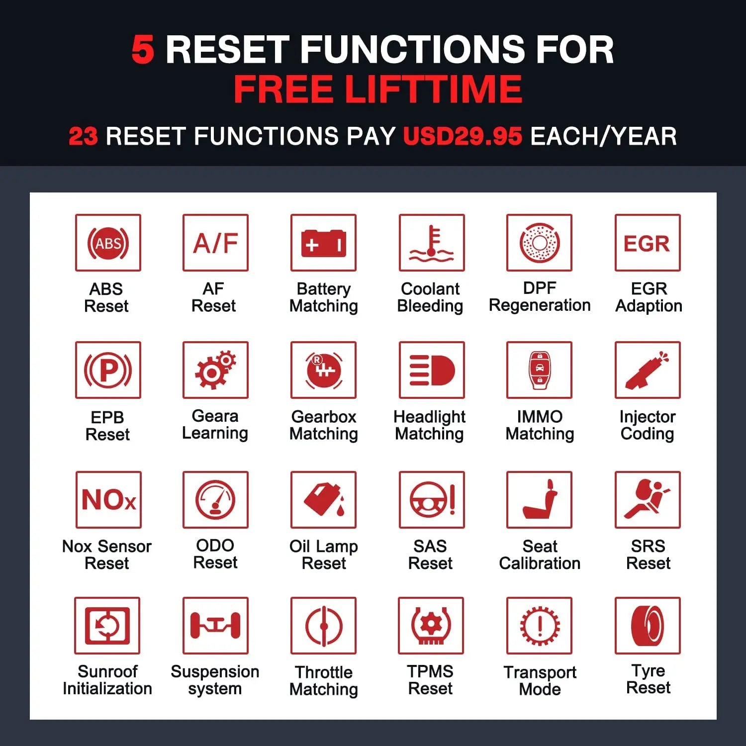Thinkcar Code Readers & Scan Tools has 28 hot reset services to complete repairs maintenance, such as ABS Bleeding, SAS, DPF, TBA/TPS, Injector Coding, Battery Matching, EPB, Gear Learning and ect., which help you to maintain your car anytime and save your money. The others subscription free is extra 29.95/Year/Each One.